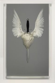 Acrylic, painted stainless steel, stainless steel, resin, silicone, sterling silver barbed wire, monofilament, bull’s heart, dove’s wings and formaldehyde solution