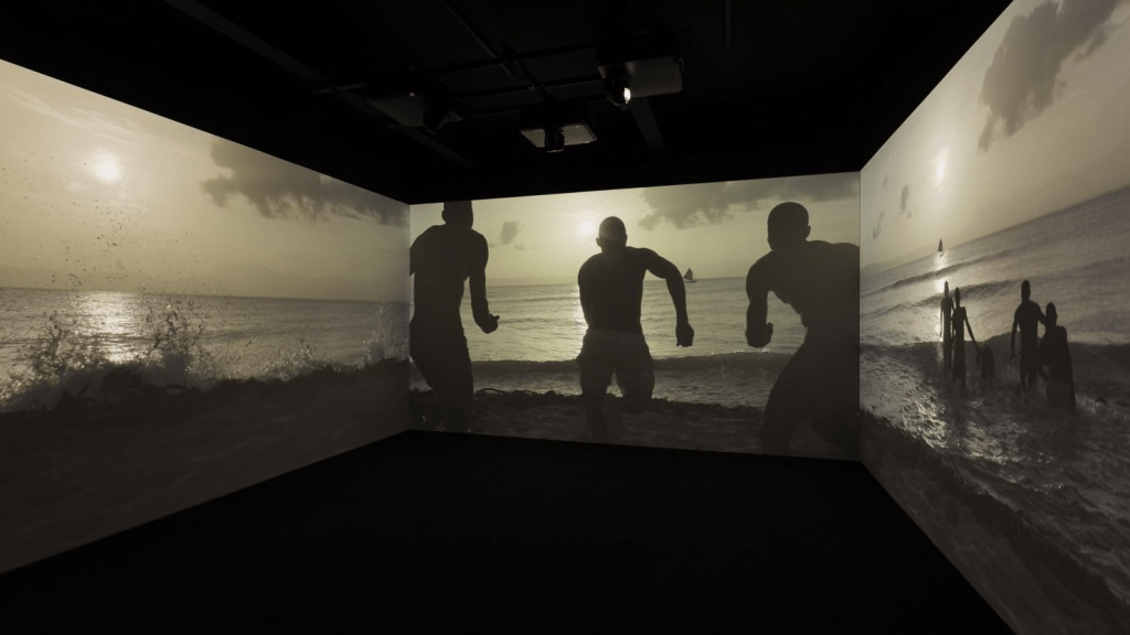 The work related to the artist location, tide to his GPS coordinates, the installation is immersive, being a 360 degree projection. “The artwork recreates the experience of what it is to be lost at sea and, symbolically, to break down geographical borders and intangible barriers between people. By putting the viewers off-balance, Kazem engages them both conceptually and physically with his work, thereby inviting them to question and challenge their perceptions of openness and universality” (quote from the website linked above). The work predominately deals with boarders and enables the viewers to pick apart and breaking down the common perceptions around the construct of the nations.