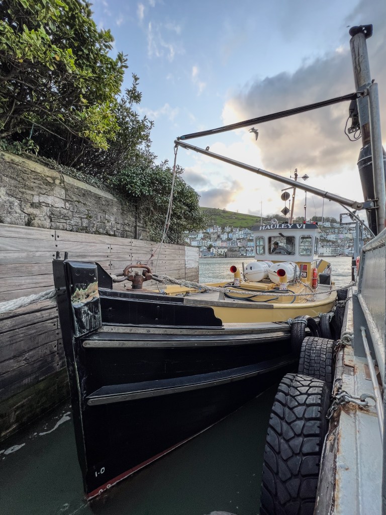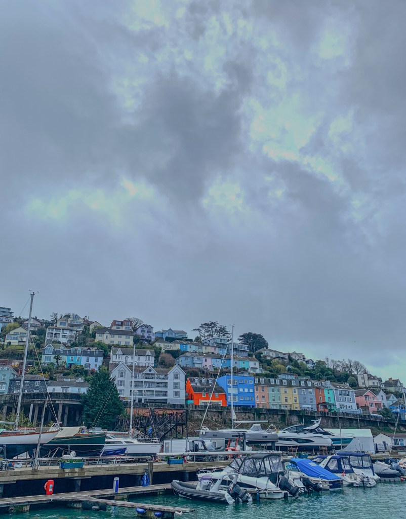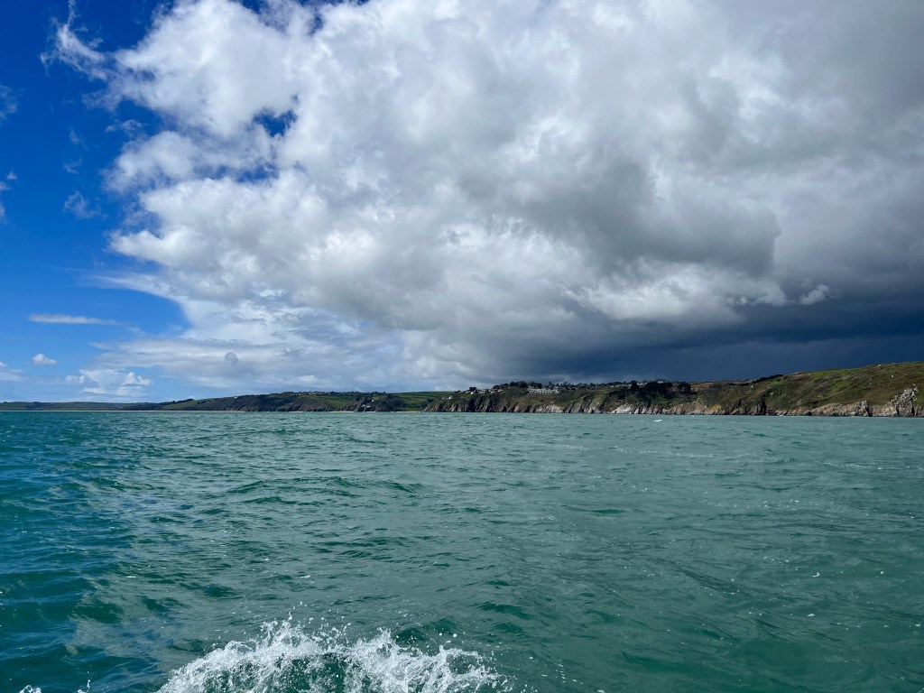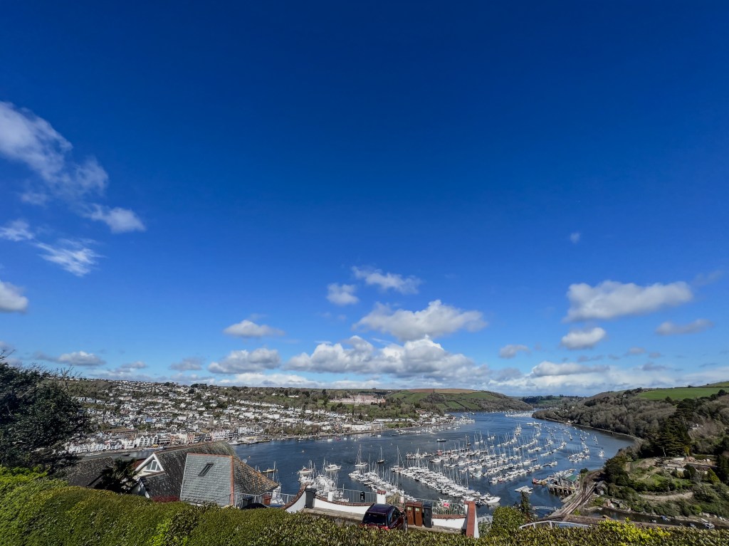We had a powerful sail to the Dart; it was fast and furious until we rounded the headland and F7, which was on our beam, ended up close to our nose. We were pinching and crashing into the swell. We did see another pod of dolphins, but the weather was lousy, making it challenging to enjoy even that; the rain was driving in from our destination. The swell was a further reminder of the pending storm we’d been tracking. To take cover, we sailed inshore as close as possible. We inched past the Mewstone and then the West Rock south cardinal buoy marking Shag Stone. Eventually, we reached the river’s mouth, virtually coming to a standstill with each wave. The entrance was impossible to see, but I trusted the charts. As we rounded Castle Ledge, and the river was revealed, it was like we’d entered another place entirely. The wind dropped, the rain disappeared, and the sun came out for a minute. We arrived in Kingswear, and it was slack water.