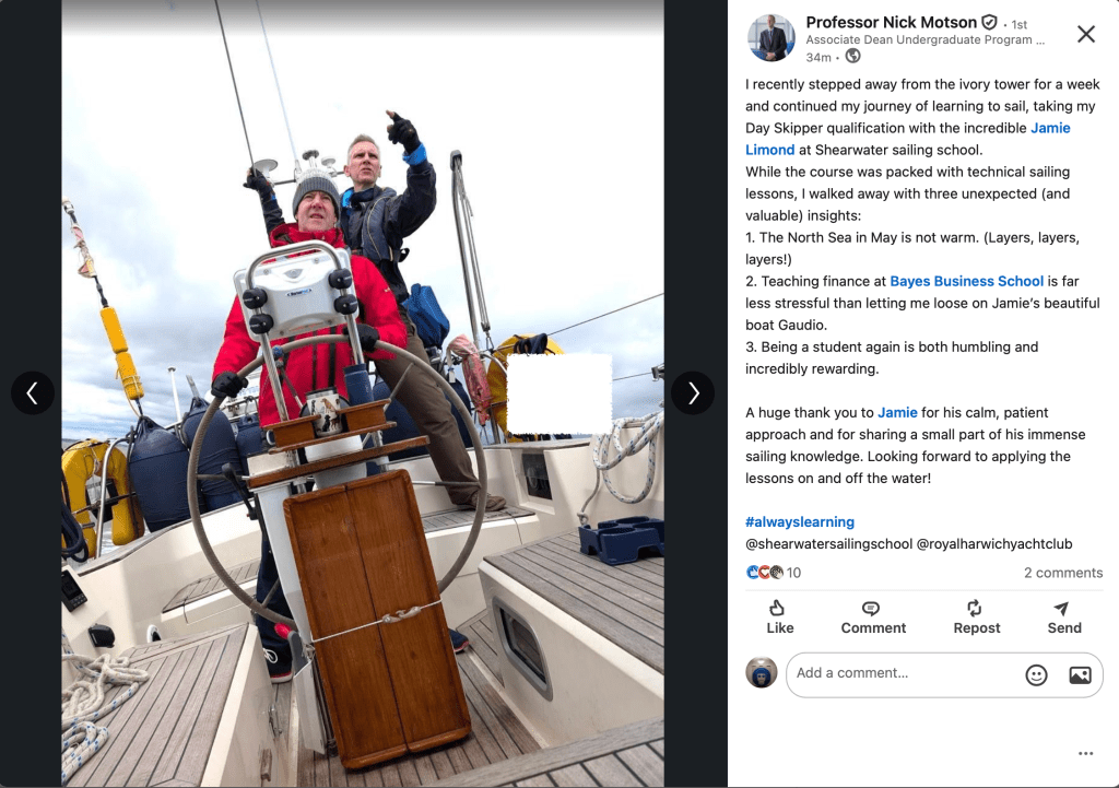 Thanks Jamie, a great evening to cap off a great week. Absolutely brilliant instruction, I feel I have learnt so much. You did a great job of bringing the Med to the Orwell (bar the weather). Would like to sail again with you & learn even more. All best, M.